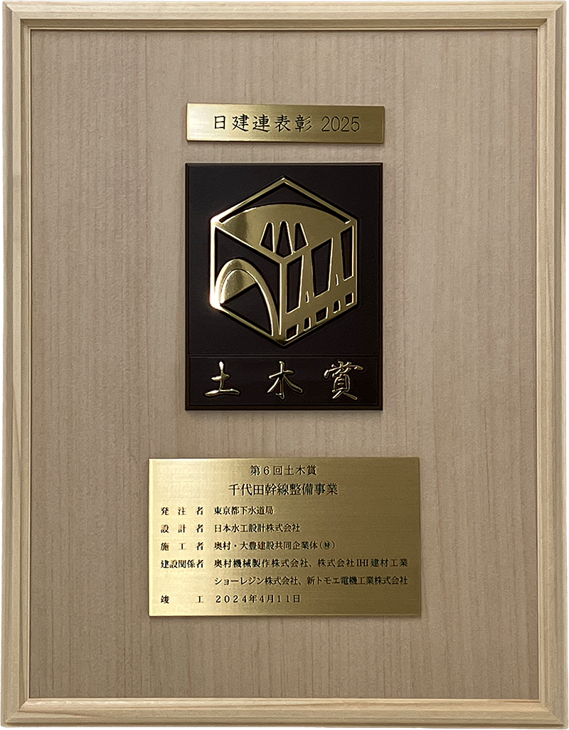 日本建設業連合会(日建連)が建築物の伝統と社会基盤の存在価値を顕彰する「日建連表彰」において、当社が製作を行ったΦ5690泥水式シールド機を使用した、『千代田幹線整備事業』が第6回土木賞(※)を受賞しました。