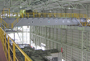 An overhead traveling crane that is under remote automatic control to perform the warehousing and shipping of a variety of goods. |